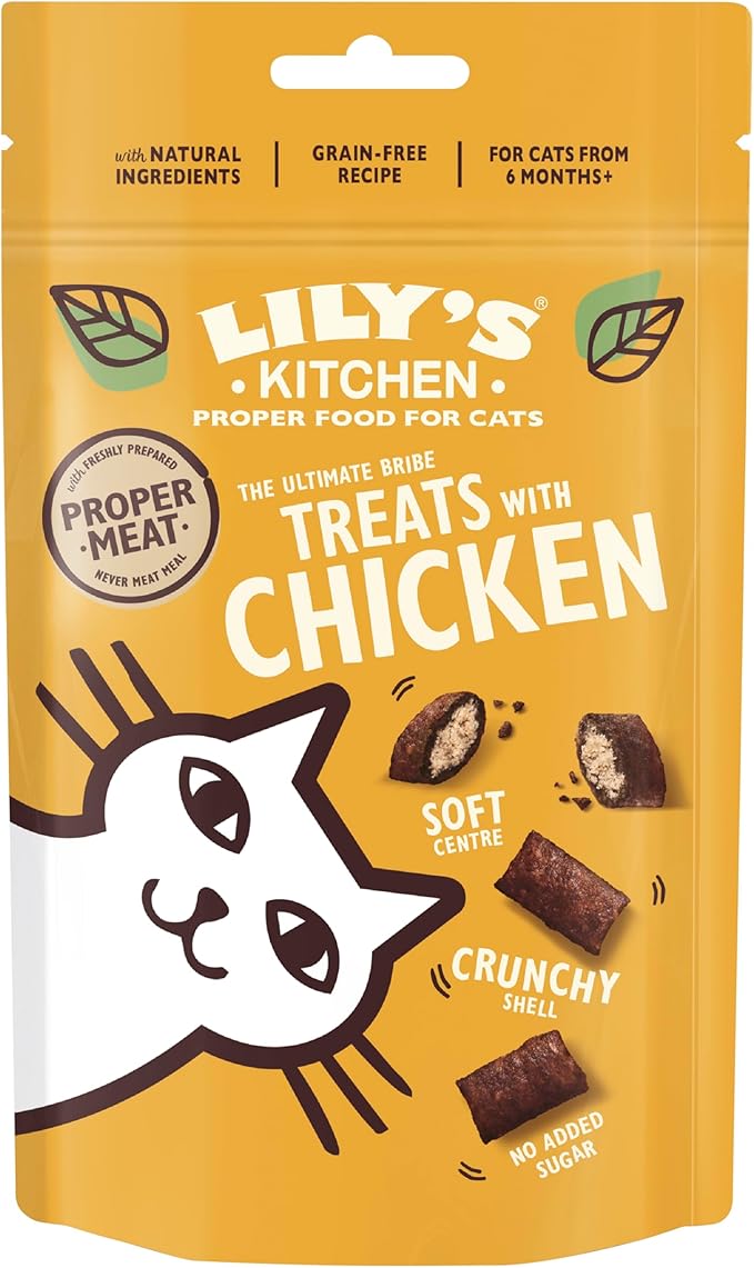Description Your cats will surely twirl it's tail for these perfectly formed pillow-shaped treats, that is soft on the inside and crunchy on the outside. The ultimate bribe for your feline friend, filled with proper nutrients combined with a crunchy texture; you can feed around 10 treats a day guilt-free, as they’re made with proper chicken and fish, and contain no added sugars or grains. Product Features: Made with proper meat and fish Natural ingredients No added sugars Grain-free recipe Crunchy on the outside, soft on the inside Technical details: Size: 60g Pet life stage: suitable for cats from 6 months old Breed recommendation: All cat breeds Food type: Treats