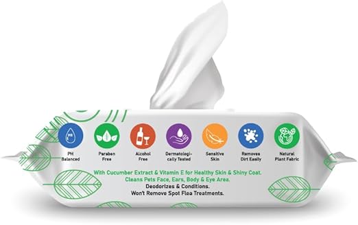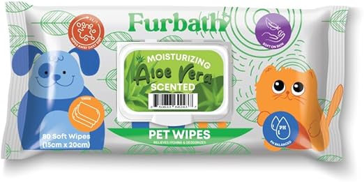 Furbath Natural Pet Wipes with Aloe Vera provide soothing care for your pet's skin. The natural aloe vera extract helps moisturize and heal dry or irritated skin. These wipes are perfect for cleaning dirt and debris while providing a calming effect. Each pack includes 80 wipes, ensuring your pet stays clean and comfortable. Ideal for pets with sensitive skin needing extra care.