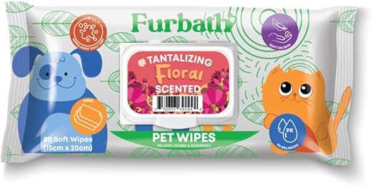 Furbath Natural Pet Wipes in the floral scent offer a refreshing way to keep your pet clean. Infused with a light, pleasant floral fragrance, these wipes leave your pet smelling fresh. The natural formula is gentle on your pet's skin and fur. With 80 wipes per pack, it's perfect for regular use. Keep your pet clean and pleasantly scented with these convenient wipes.